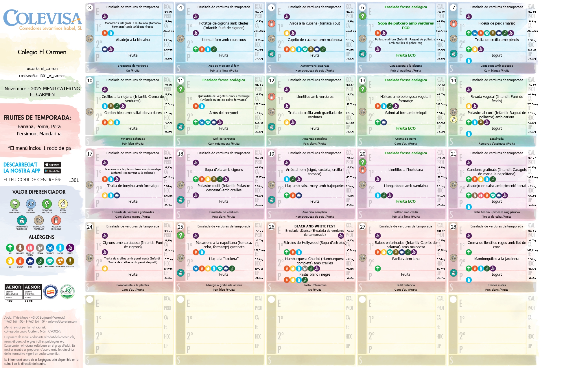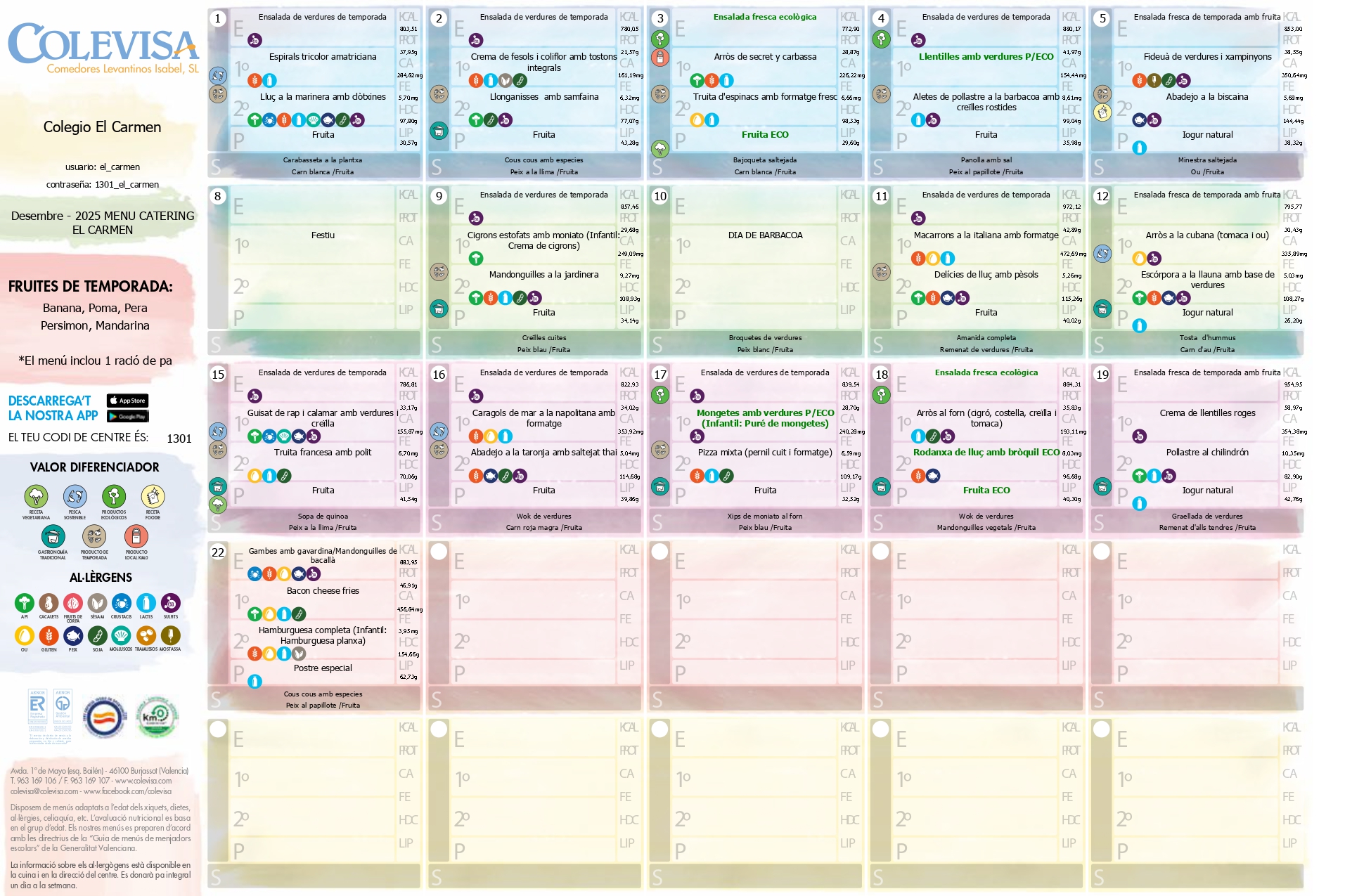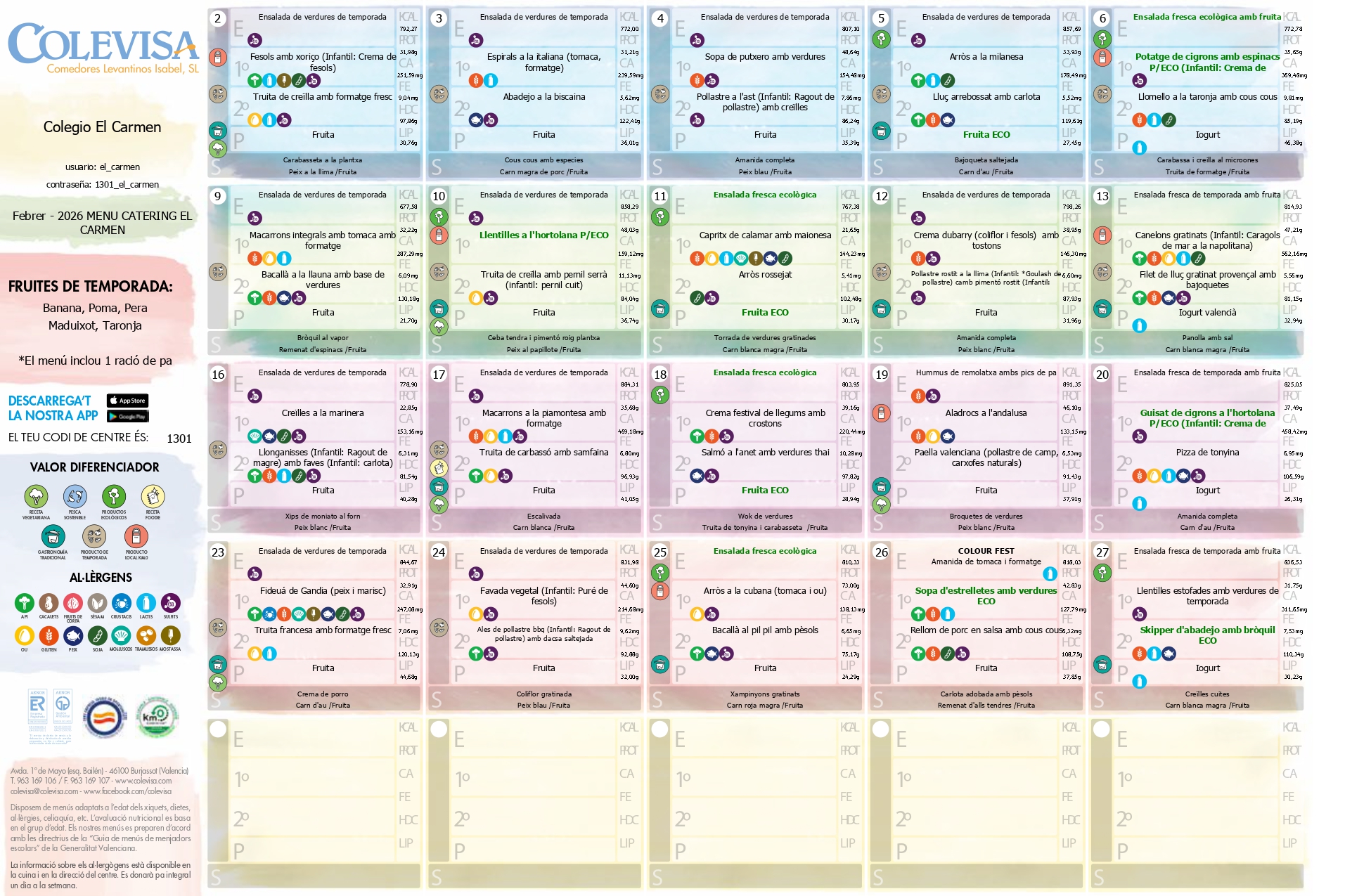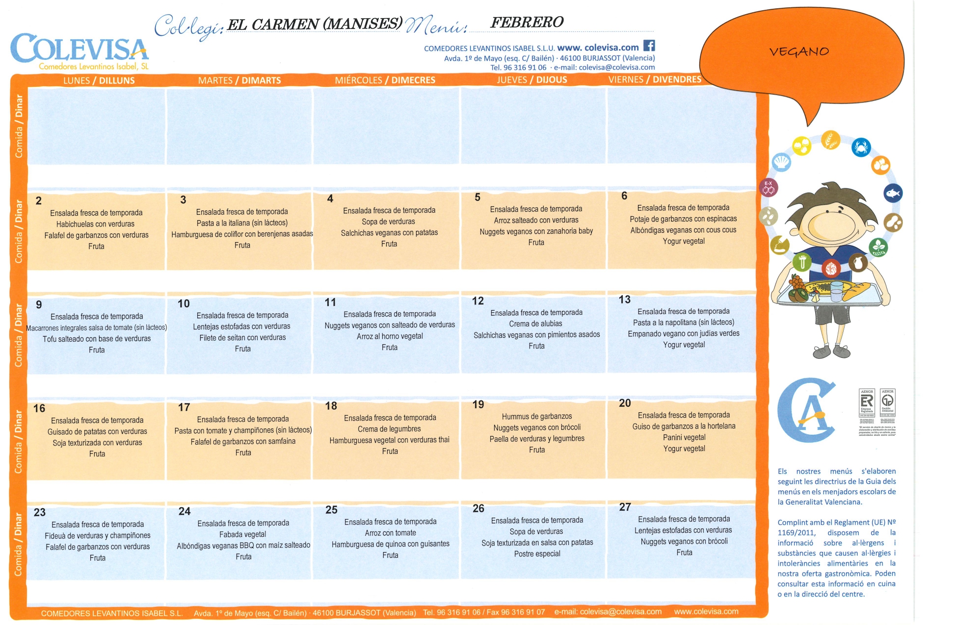 Ofrecemos menús equilibrados garantizando una alimentación variada y amena, adecuada para el completo desarrollo físico e intelectual en la edad escolar. Todo ello de la mano de la empresa COLEVISA.